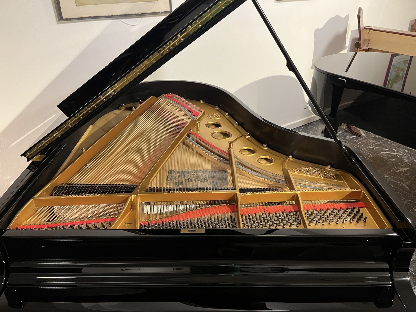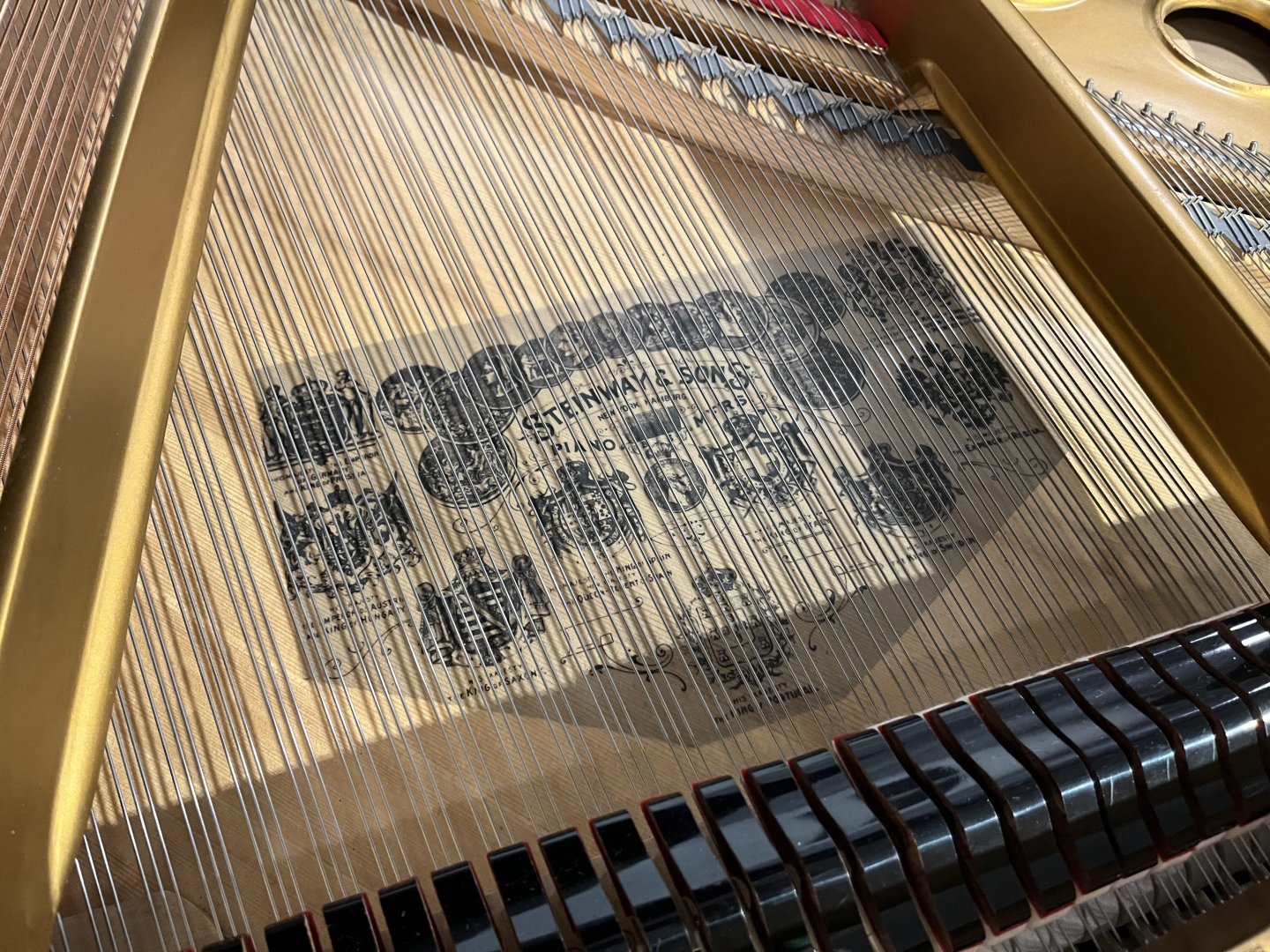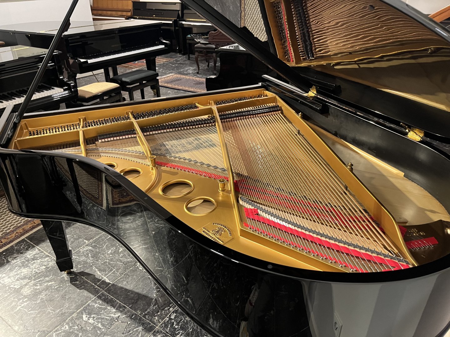 In unserer Werkstatt wurden Hammerköpfe, Hammerstiele, Dämperfilze und Hebeglieder mit Originalteilen von Steinway & Sons erneuert. Wir haben außerdem den Resonanzboden und die Gussplatte lackiert und die Diskantsaiten, Basssaiten und Stimmwirbel erneuert. Der Flügel erhielt eine neue schwarze Polyester Oberfläche in Hochglanzoptik. Abschließend erfolgte eine sorgfältige Intonation und Regulierung, einschließlich der Anpassung des Tastengewichts und Mehrfachstimmung. Das Instrument befand sich zuvor in Privatbesitz und wurde uns nach zwei Generationen verkauft. Aufgrund seines hohen Alters wurde es in unserer Werkstatt umfassend überarbeitet und präsentiert sich nun in einem „neuwertigen” Zustand mit Designelementen, die man heute bei einem Steinway nicht mehr findet.