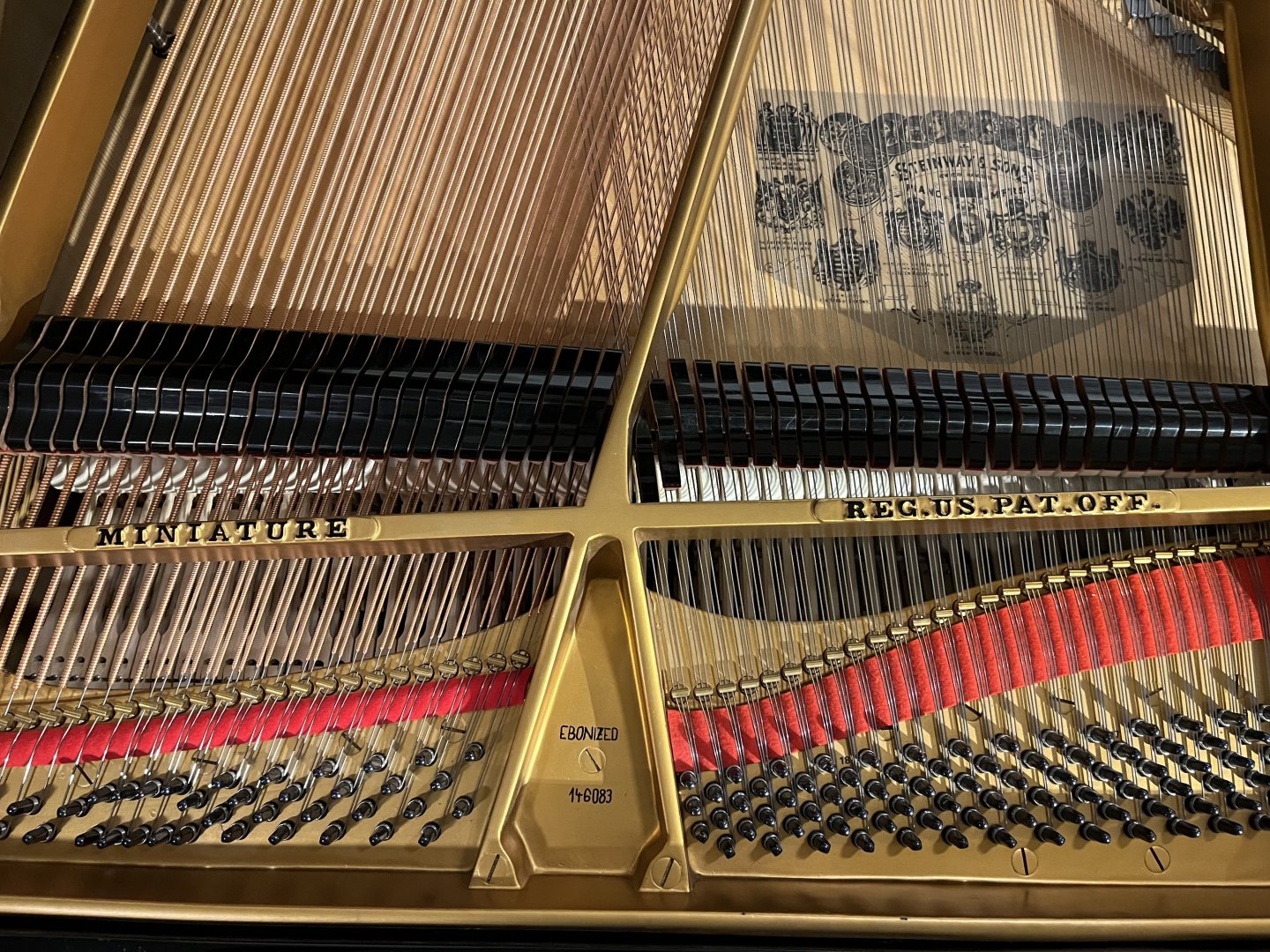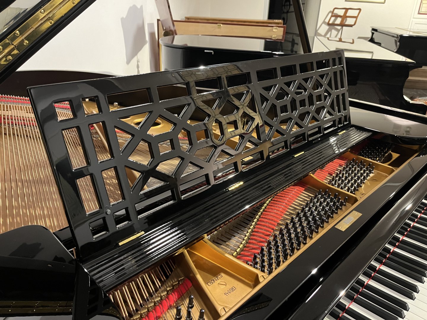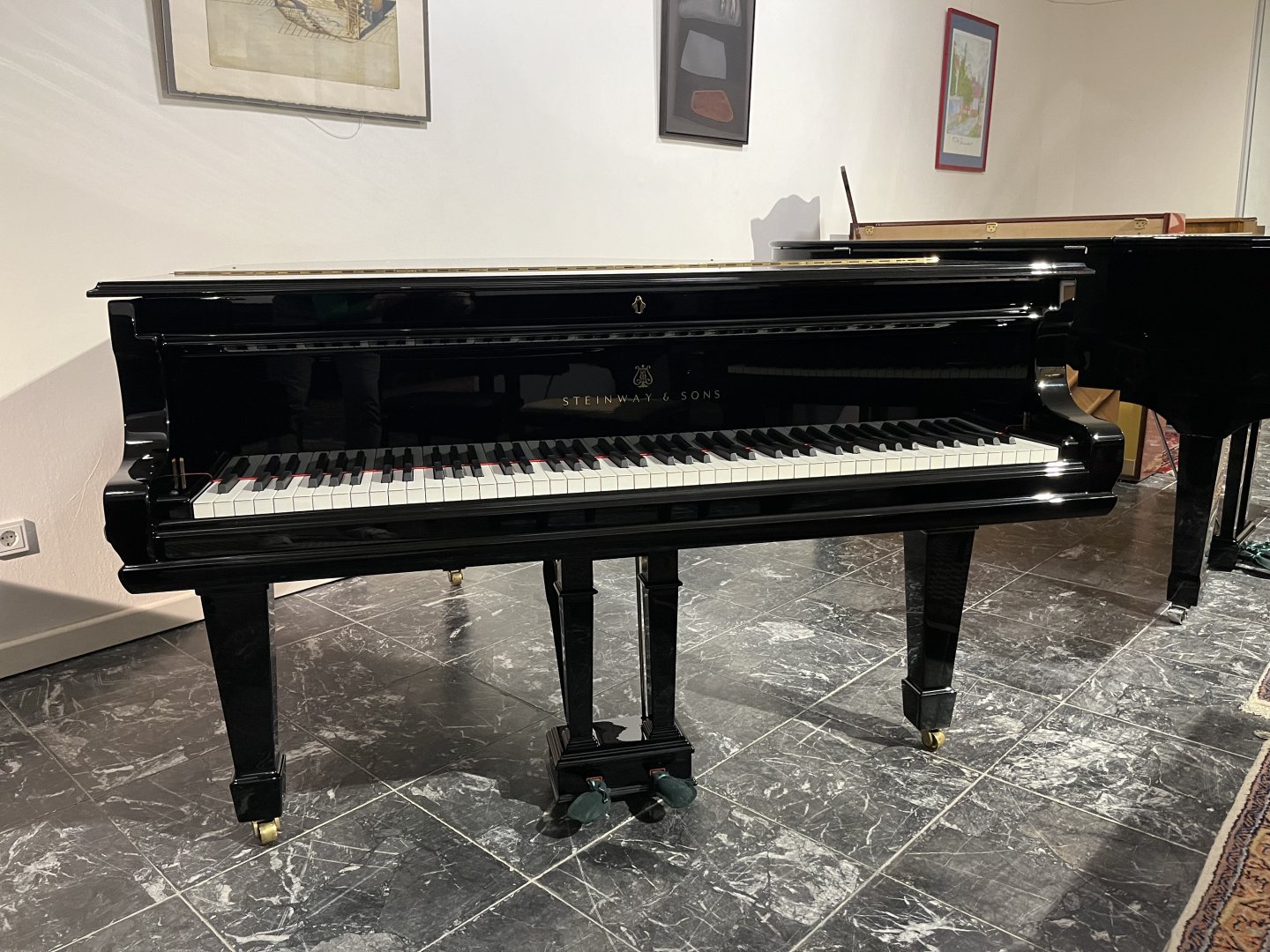 In unserer Werkstatt wurden Hammerköpfe, Hammerstiele, Dämperfilze und Hebeglieder mit Originalteilen von Steinway & Sons erneuert. Wir haben außerdem den Resonanzboden und die Gussplatte lackiert und die Diskantsaiten, Basssaiten und Stimmwirbel erneuert. Der Flügel erhielt eine neue schwarze Polyester Oberfläche in Hochglanzoptik. Abschließend erfolgte eine sorgfältige Intonation und Regulierung, einschließlich der Anpassung des Tastengewichts und Mehrfachstimmung. Das Instrument befand sich zuvor in Privatbesitz und wurde uns nach zwei Generationen verkauft. Aufgrund seines hohen Alters wurde es in unserer Werkstatt umfassend überarbeitet und präsentiert sich nun in einem „neuwertigen” Zustand mit Designelementen, die man heute bei einem Steinway nicht mehr findet.
