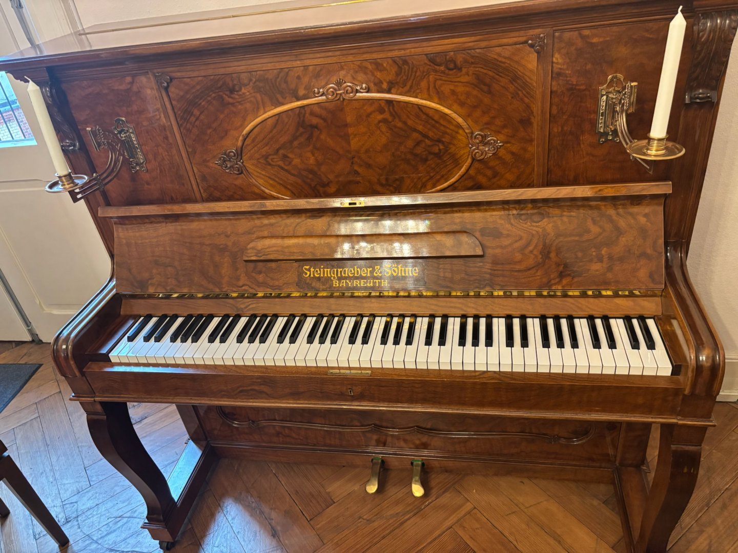 Dieses historische 134 cm große Steingraeber Klavier wurde 1910 in Bayreuth hergestellt. Das Klavier besticht mit einem deutlichen sonoren Bass und gleichzeitig klaren Tönen im Diskant, typisch für Steingraeber. Die Spielart hat Charakter und sucht einen Spieler, der sich genau darüber freut. Die Oberfläche in echtem Nußbaum mit Schellack ist gut erhalten und weist nur geringe Gebrauchsmerkmale auf. Mit den Verzierungen und den originalen Kerzenleuchtern ist das Instrument ein echter Hingucker. Und natürlich perfekt restauriert! Das Instrument wurde in unserer Meisterwerkstatt fachgerecht und mit einem besonderen Auge fürs Detail restauriert und ist somit in einem neuwertigen Zustand. Freuen Sie sich auf eine lange Spielfreude dank neuer Saiten, neuem Stimmstock, neuen Stimmwirbeln und neuen Hammerköpfen-